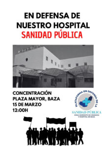 La Plataforma en Defensa de la Sanidad Pública convoca una concentración el 15 de marzo reclamando mejoras en la atención y el mantenimiento de los servicios del Hospital. La Plataforma en Defensa de la Sanidad Pública del nordeste de Granada ha convocado una concentración ciudadana para el próximo domingo 15 de marzo, a las 12.00 horas, en la Plaza Mayor de Baza, con el objetivo de reclamar mejoras en la atención sanitaria de la comarca y defender el mantenimiento de los servicios del Hospital de Baza.