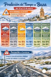 Por su parte, la Agencia Estatal de Meteorología ha activado un aviso naranja por nevadas en la comarcas de Guadix, Baza y Huéscar durante el martes 10 de marzo, a partir de las 0:00 horas. Se esperan acumulaciones de nieve que podrían alcanzar hasta 5 centímetros en 24 horas, especialmente en áreas situadas por encima de los 1.200 metros, con una cota de nieve que descenderá hasta 900-1.000 metros. las autoridades recomiendan extremar la precaución durante el martes, especialmente en carreteras del norte granadino y zonas de montaña, donde la nieve podría dificultar la circulación. También se aconseja seguir la evolución de la situación meteorológica ante posibles cambios en los avisos.