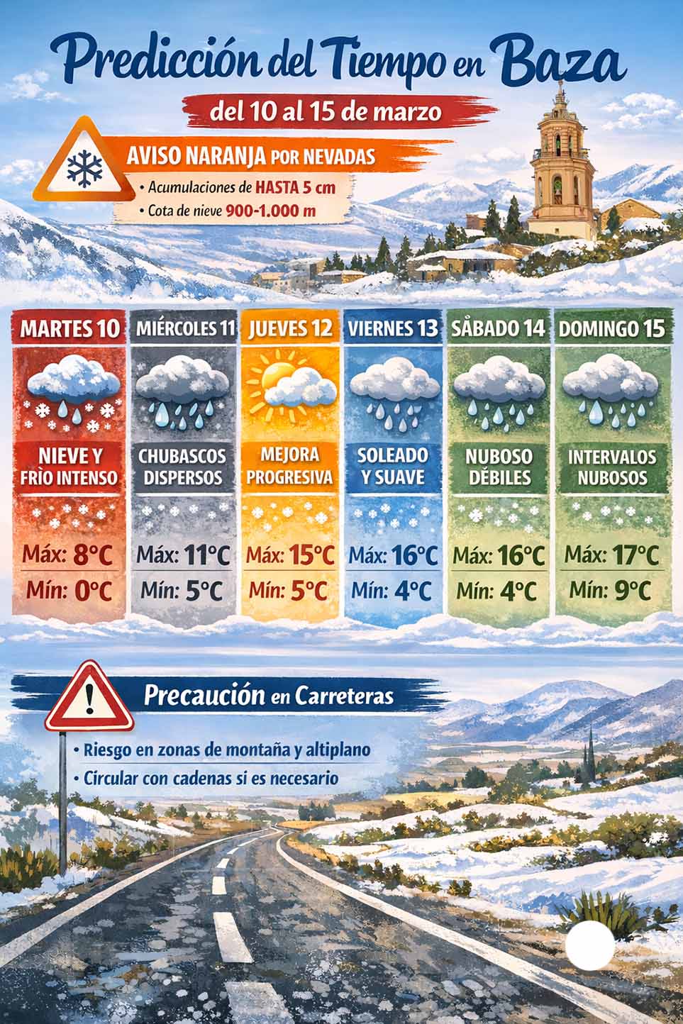 En resumen, la semana comenzará con un episodio invernal significativo en la comarca de Baza, con nevadas y temperaturas muy bajas el martes, seguido de una progresiva mejoría del tiempo a partir del miércoles y un ambiente más templado de cara al fin de semana.