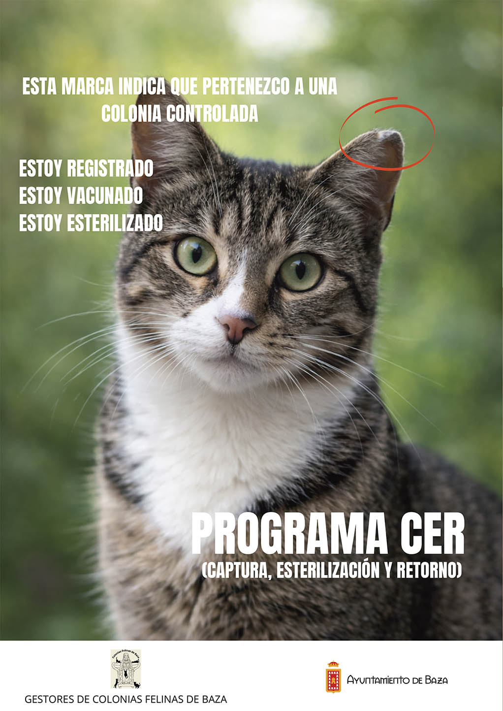 Ayuntamiento y voluntariado avanzan en el control de colonias felinas con el método CER en Baza. El Ayuntamiento de Baza y el grupo de personas voluntarias encargadas de la gestión de colonias felinas en la ciudad están desarrollando de forma coordinada el programa CER (Captura, Esterilización y Retorno), un sistema de control ético de la población de gatos comunitarios que ya ha permitido esterilizar cerca de un centenar de animales en el municipio.