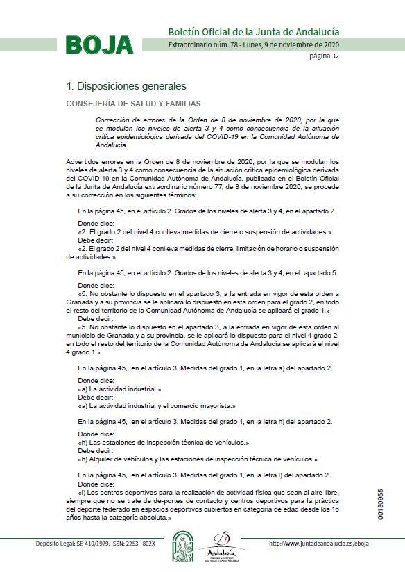 La publicación de las nuevas restricciones recogidas en el BOJA extraordinario número 77 de 08/11/2020 contiene una serie de errores que se han corregido con posterioridad. En todo este maremágnum de órdenes, decretos, medidas… y demás, hay que añadir la existencia de una serie de errores en la publicación de la entrada en vigor de las nuevas restricciones recogidas en el BOJA extraordinario número 77 de 08/11/2020, el cual ha servido como base para dar a conocer la nueva normativa.