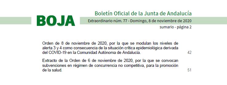 En este contexto normativo derivado del estado de alarma vigente y ante la evolución de la situación epidemiológica y sanitaria se ha dictado, entre otras, la Orden de la Consejería de Salud Orden de 8 de noviembre de 2020, cuyo objeto es modular los niveles de alerta 3 y 4 previstos en la Orden de la Consejería de Salud y Familias de 29 de octubre de 2020, por la que se establecen los niveles de alerta sanitaria y se adoptan medidas temporales y excepcionales por razón de salud pública en Andalucía, para la contención de la COVID-19, mediante la aplicación de medidas vinculadas al establecimiento de un grado 1 en los niveles de alerta 3 y 4 relativo a una limitación horaria, y en el caso del nivel 4, se establece además un grado 2 reforzado vinculado a la gravedad de la situación epidemiológica.