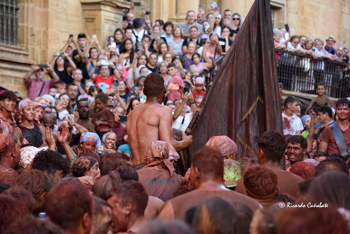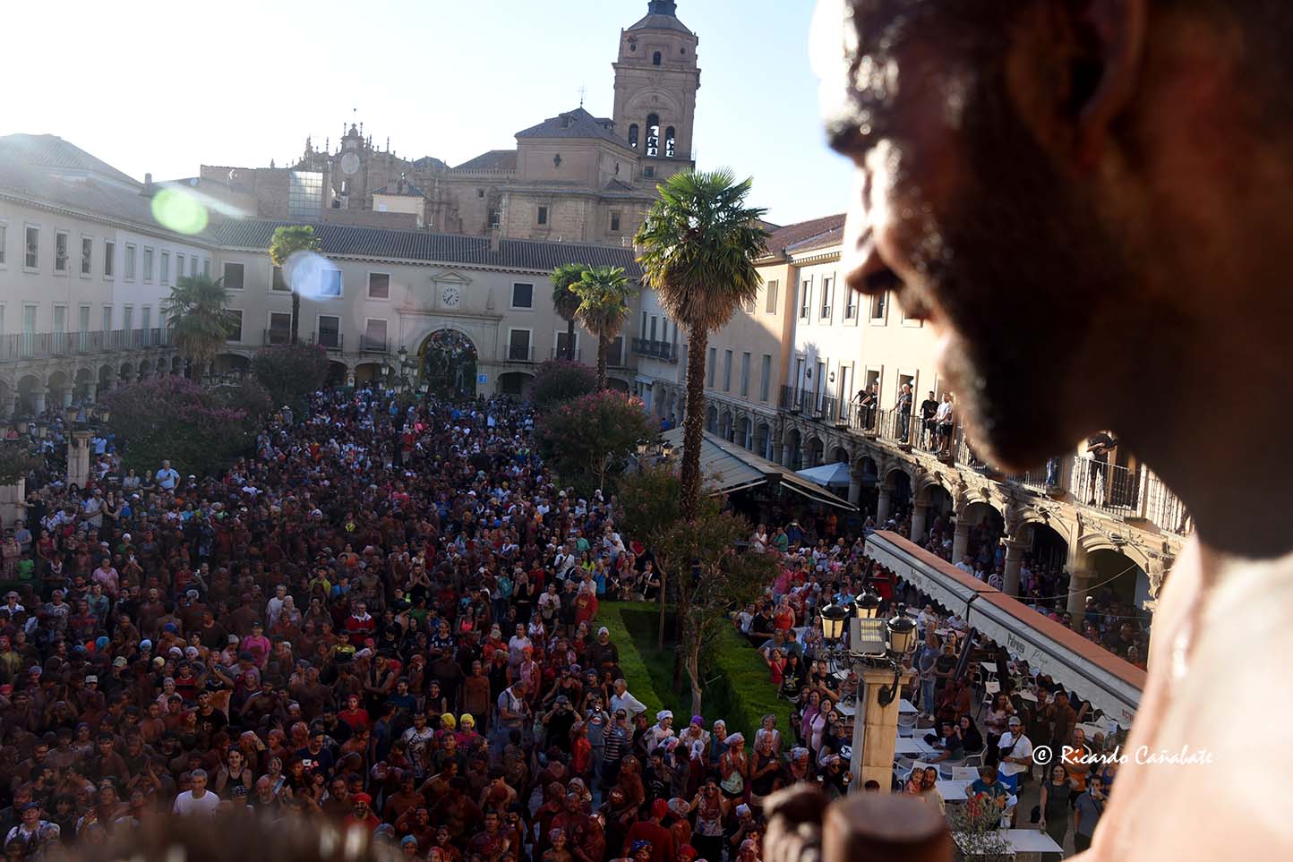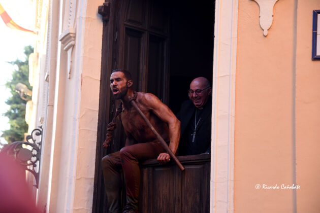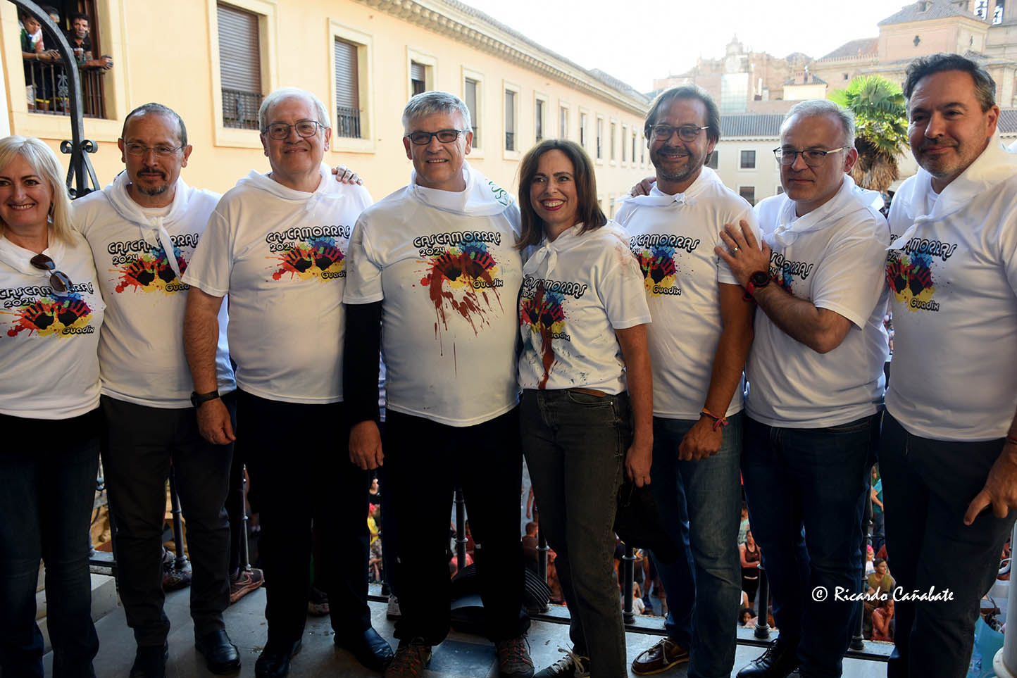 Haciendo camino, la unión entre Cascamorras y cascamorreros es ya una simbiosis total y así se llega a la mítica Plaza de las Palomas, con subida al balcón consistorial -donde se encontró un desembarco en toda regla del PP, con la consejera de Fomento a la cabeza, el delegado de la Junta, delegados provinciales varios y, cómo es normal, los alcaldes de Baza y Guadix. Saludos para todos y, rápidamente, riego a quienes abajo permanecían, esta vez solo con agua y sin espuma, merengazo y a retomar la carrera camino para ir a saludar al obispo que, aunque la primera vez hizo oídos sordos, se sumaba una y otra vez a aquello de “bastetano el que no bote”, con saltos acompasados con la multitud que lo jaleaba.