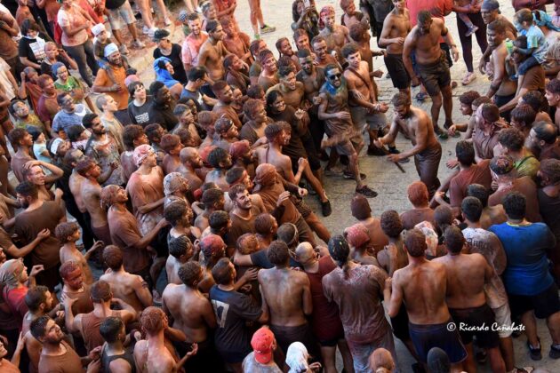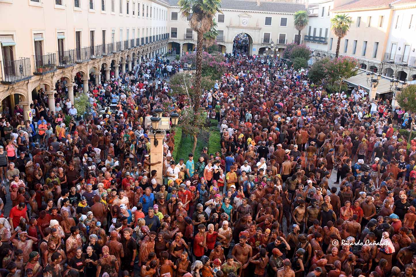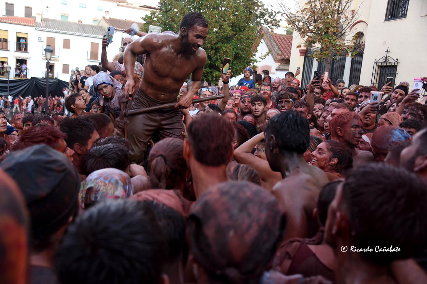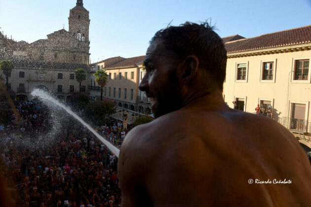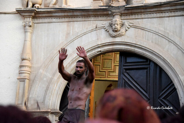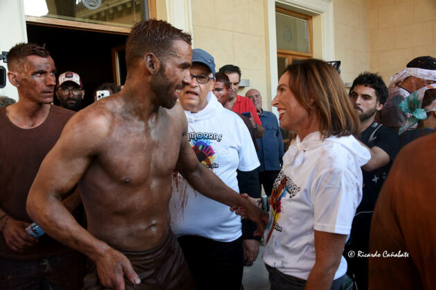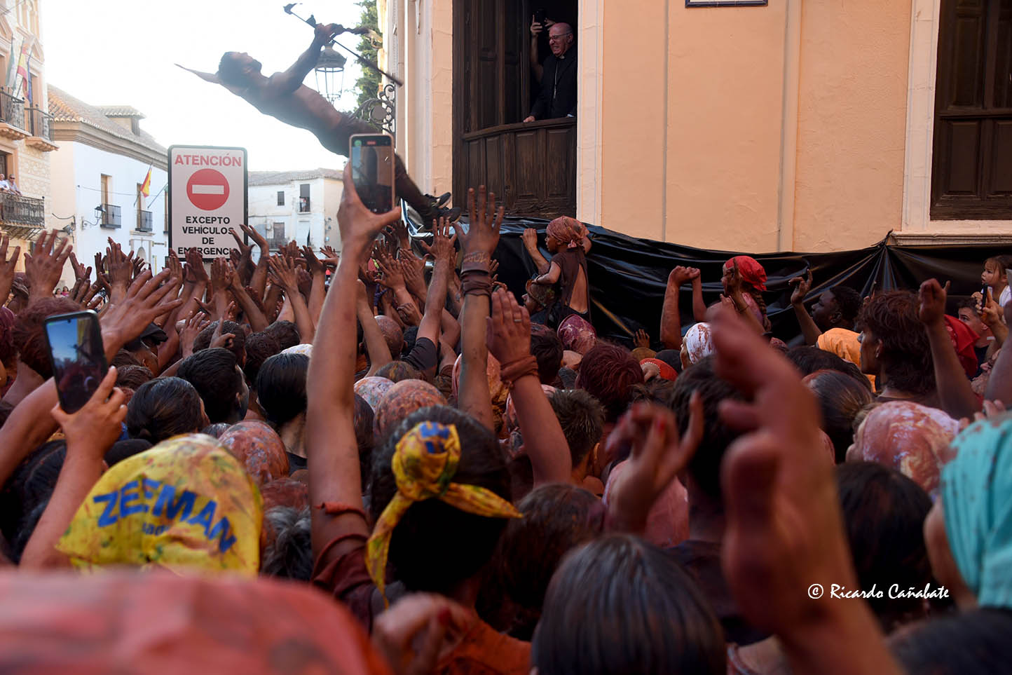 Haciendo camino, la unión entre Cascamorras y cascamorreros es ya una simbiosis total y así se llega a la mítica Plaza de las Palomas, con subida al balcón consistorial -donde se encontró un desembarco en toda regla del PP, con la consejera de Fomento a la cabeza, el delegado de la Junta, delegados provinciales varios y, cómo es normal, los alcaldes de Baza y Guadix. Saludos para todos y, rápidamente, riego a quienes abajo permanecían, esta vez solo con agua y sin espuma, merengazo y a retomar la carrera camino para ir a saludar al obispo que, aunque la primera vez hizo oídos sordos, se sumaba una y otra vez a aquello de “bastetano el que no bote”, con saltos acompasados con la multitud que lo jaleaba.