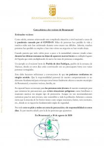 El llamamiento cobra especial relieve cuando se dirige a los jóvenes, afirmando que la mayoría de brotes se originan en actividades como reuniones, fiestas u ocio nocturno “donde no se siguen las fundamentales reglas de seguridad” y termina pidiendo precaución y responsabilidad por parte de todos, en beneficio de la salud propia y de las personas a las que queremos.