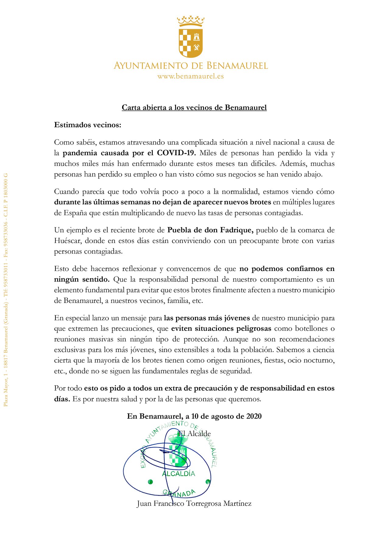 El alcalde de Benamaurel también se dirige a sus vecinos tras la aparición de nuevos brotes en la zona. Como ya han hecho otros alcaldes de la zona, el alcalde benamaurelense, Juan Francisco Torregrosa, se dirigía ayer a sus vecinos considerando que “estamos atravesando una complicada situación a nivel nacional” en la que la pandemia ha dejado ya un rastro de enfermos y fallecidos, entre los afectados, y de pérdidas de empleo o caídas en nuestros negocios.