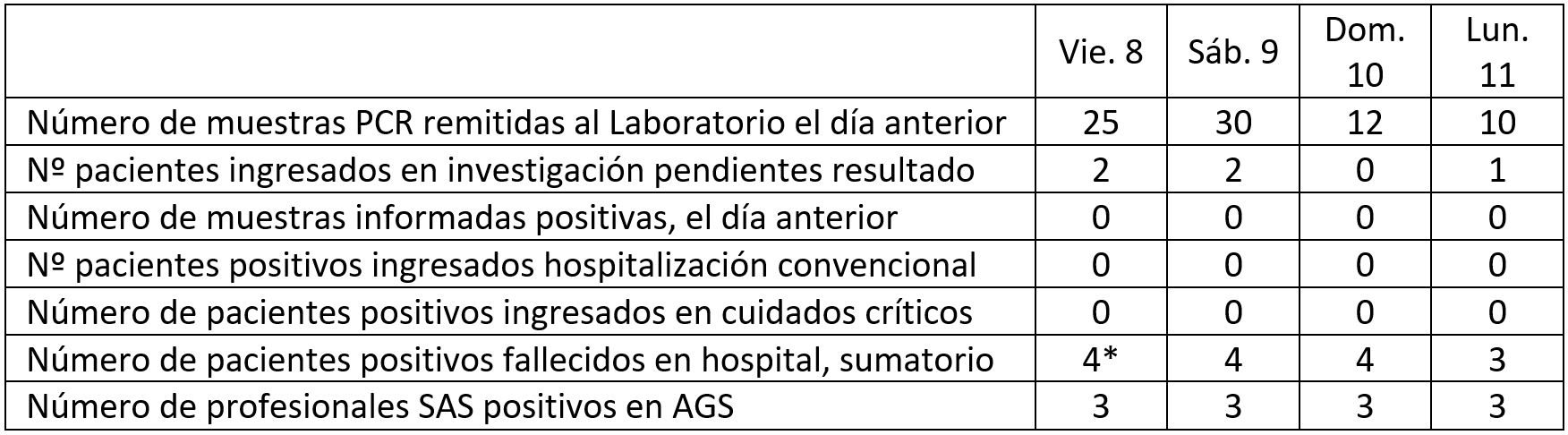 Como se puede apreciar, se corrige el número de fallecidos positivos y vuelven a ser 3 los fallecimientos que se contabilizan en el sumatorio, dado que el cuarto paciente, como ya se advirtió en su momento, era un paciente con Covid, Ig G positivo, pero no fallecido por Covid.