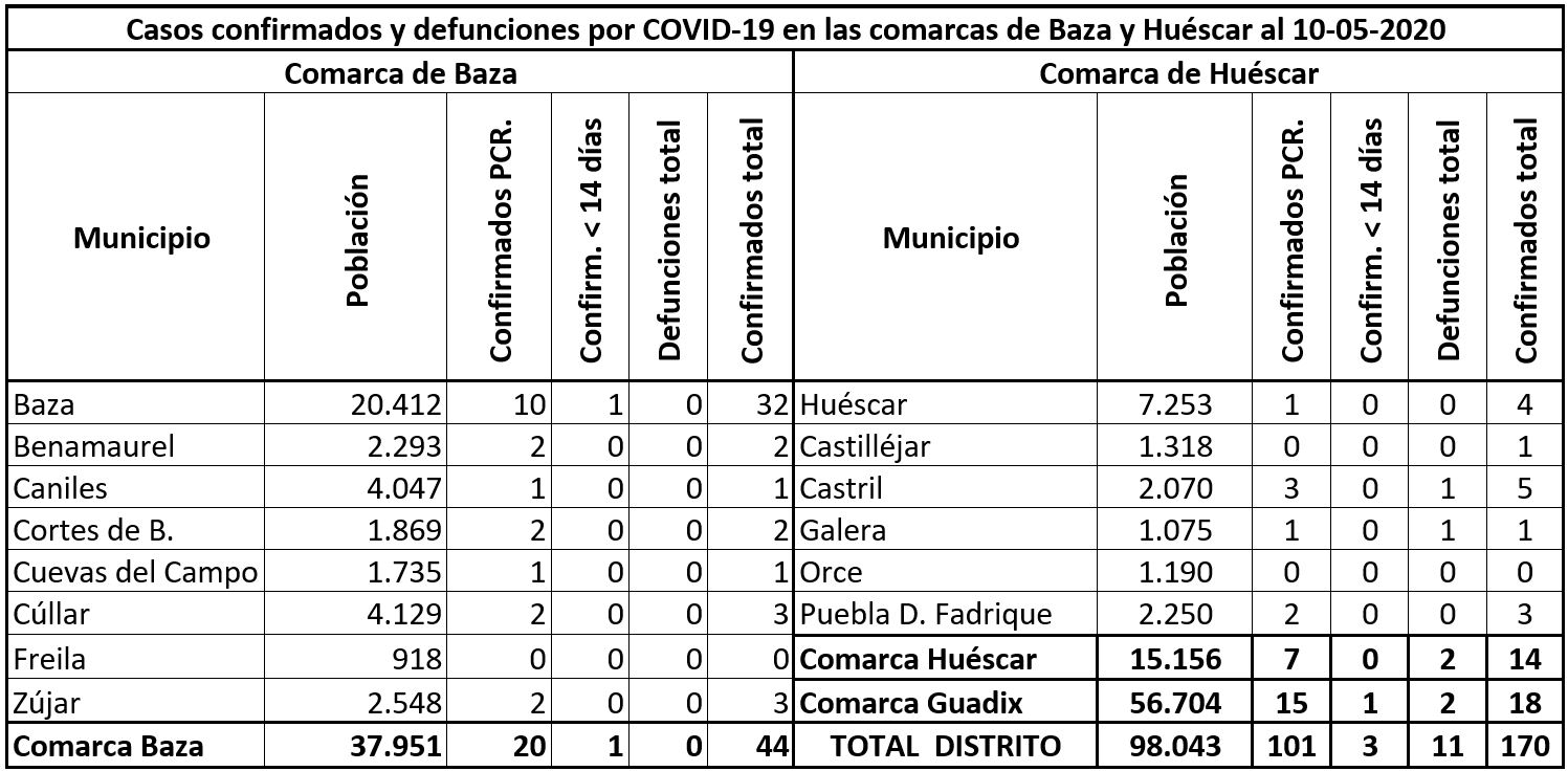Datos ofrecidos por la Junta de Andalucía para las comarcas de Baza y Huéscar. Datos referidos al domingo 10 de mayo, que son los que se pasaron al Ministerio de Sanidad un día antes, y en los que hemos tomado los datos relativos a las comarcas y el total de nuestra Área Sanitaria, así como a los municipios de las comarcas de Baza y Huéscar.