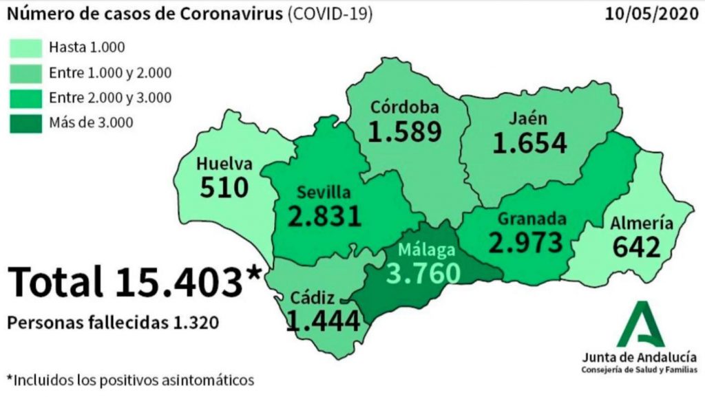 Por su parte, la Consejería de Salud y Familias, en colaboración con el Instituto de Estadística y Cartografía de Andalucía, ofrece sus propias cifras sobre la situación en nuestra Área Sanitaria, referida a todo su conjunto, y correspondiente al 9 de mayo de 2020, fecha en la que se daban a conocer los siguientes datos, en los que figura entre paréntesis los del día anterior: