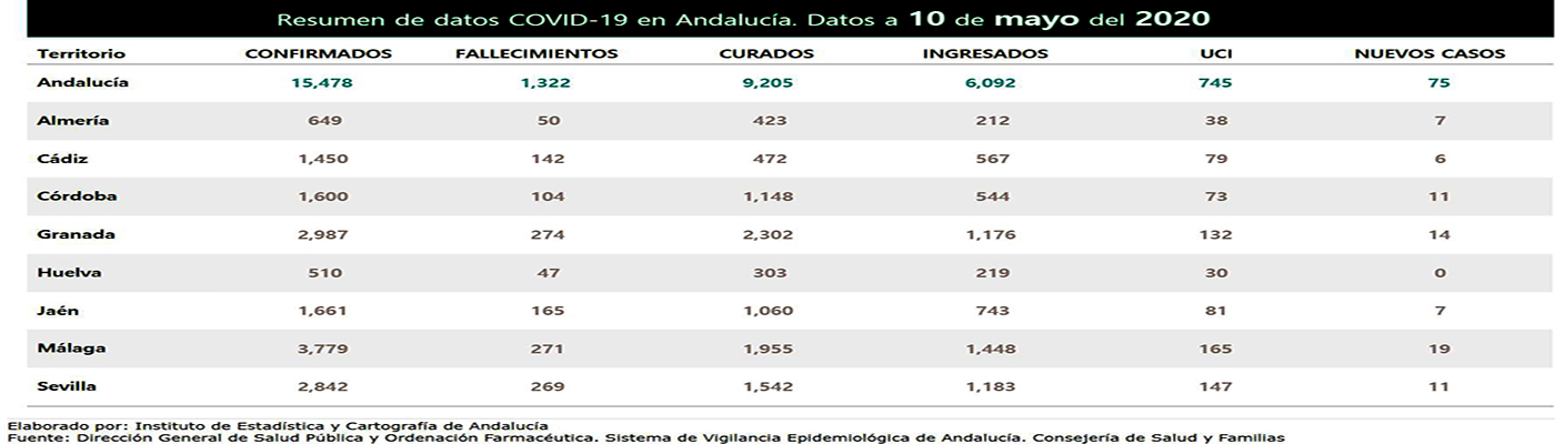 Por su parte, la Consejería de Salud y Familias, en colaboración con el Instituto de Estadística y Cartografía de Andalucía, ofrece sus propias cifras sobre la situación en nuestra Área Sanitaria, referida a todo su conjunto, y correspondiente al 9 de mayo de 2020, fecha en la que se daban a conocer los siguientes datos, en los que figura entre paréntesis los del día anterior: