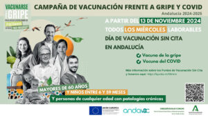 Andalucía vacunará sin cita frente a la gripe y el Covid todos los miércoles a la población diana en 623 puntos. La Consejería de Salud y Consumo, a través de la Dirección General de Salud Pública y Ordenación Farmacéutica y el Servicio Andaluz de Salud, comenzará a vacunar sin cita frente a la gripe y/o el Covid a la población diana todos los miércoles a partir del día 13 en los 623 puntos habilitados, de los cuales 212 puntos incluyen horario de tarde. Ese día, además, comienza la vacunación para el último de los grupos de riesgo incluidos en la campaña 2024-2025, de este modo, podrán vacunarse también los convivientes en el hogar con personas de 60 años o más, enfermos crónicos, embarazadas y puérperas, y las personas fumadoras.