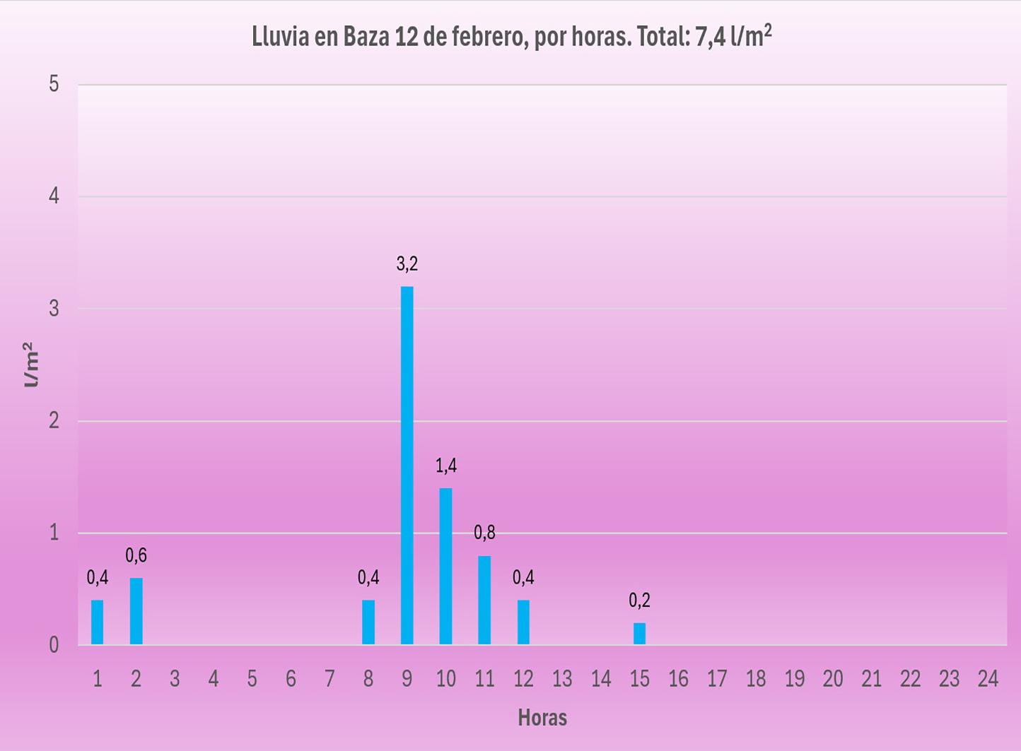 Ayer finalizaba el episodio de lluvias con un nuevo aporte de 7,4 l/m2 según la estación de AEMET en Baza. Casi siete litros y medio de lluvia que se recogía ayer lunes en nuestra ciudad y que, unidos a los 19,8 l/m2 caídos en los tres días precedentes, nos hacen asombrarnos, casi, de que en cuatro días hayan caído sobre Baza 27,2 l/m2, cantidad que incluso se ha superado en otros parajes de esta misma zona y a la que se une la caída de nieve, que algo más aportará, en las cumbres de las comarcas del norte granadino, en unos momentos en los que la prolongada sequía llegaba ya a extremos que se estaban haciendo insostenibles, para el campo y para el consumo humano.