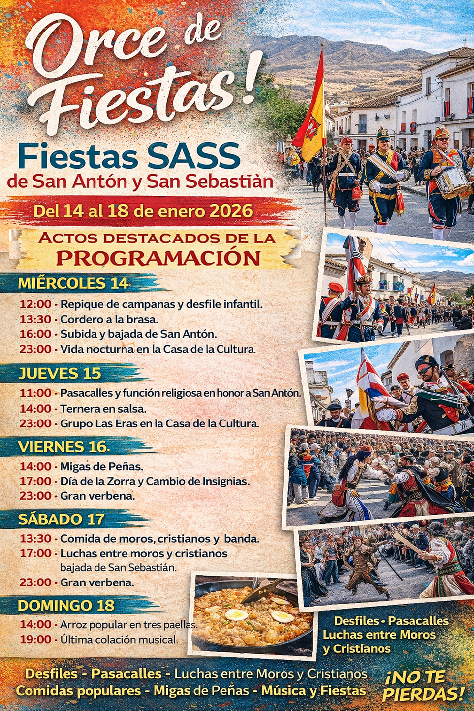 Orce ya calienta motores para las Fiestas SASS 2026, del 14 al 18 de enero y ofertando tradición, música y convivencia. Las Fiestas de San Antón y San Sebastián (SASS) 2026 convertirán Orce, del miércoles 14 al domingo 18 de enero, en un escenario continuo de celebraciones donde la tradición, la devoción y la diversión compartirán protagonismo. El programa combina actos religiosos, desfiles, gastronomía popular y música en directo, con propuestas para todas las edades y horarios pensados para disfrutar intensamente cada jornada.
