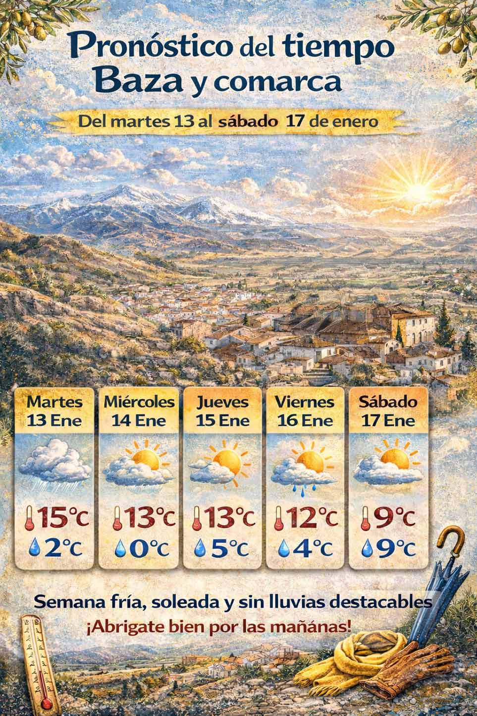 En conjunto, se espera una semana fría pero mayoritariamente tranquila en Baza y su comarca, con pocas lluvias y condiciones favorables para actos festivos y reuniones al exterior, especialmente entre el mediodía y primeras horas de la tarde.