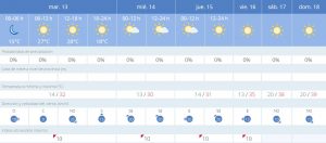 Para hoy se esperan unas temeraturas máxima y mínima de 32 y 14ºC, que mañana bajarán hasta los 30 y 13ºC, comenzando un aumento a partir del jueves que nos volverá a llevar a los 40ºC el sábado o domingo próximos.