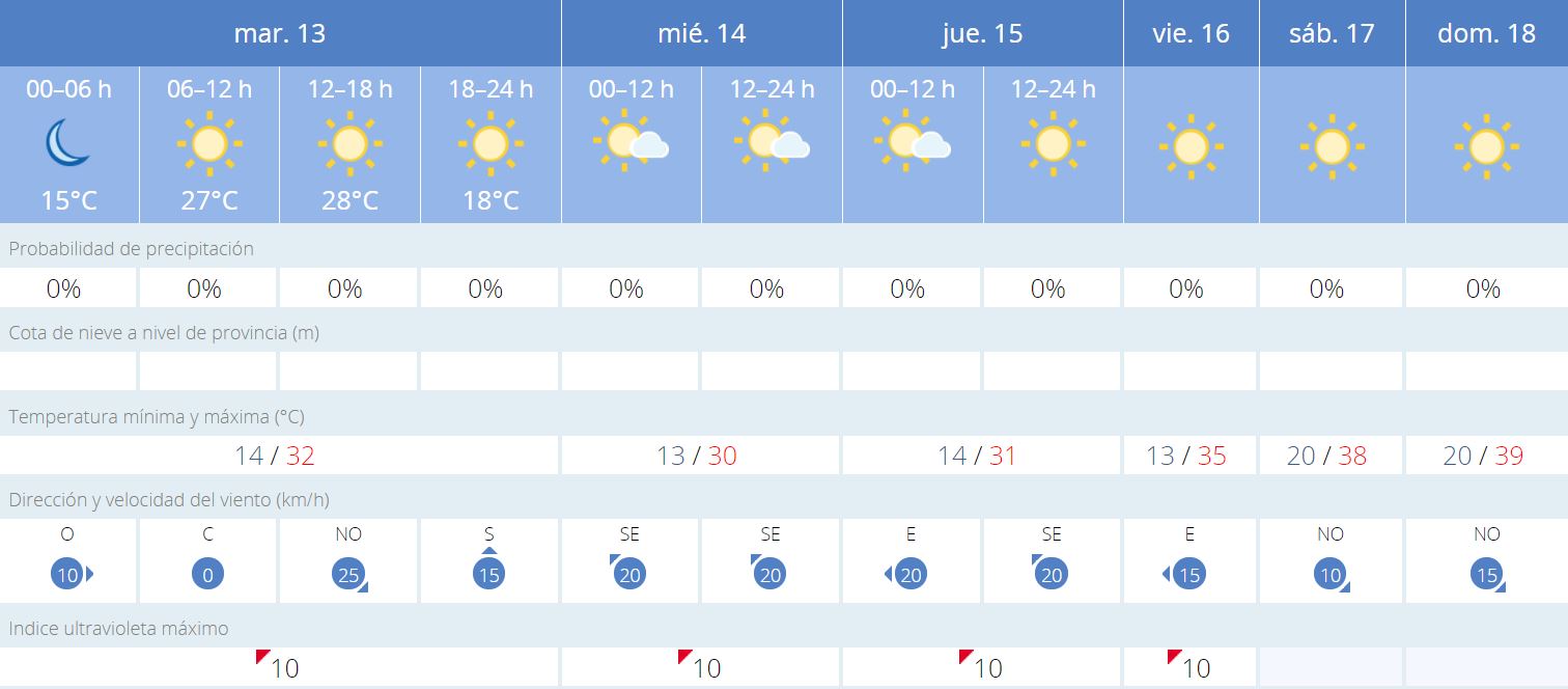 Para hoy se esperan unas temeraturas máxima y mínima de 32 y 14ºC, que mañana bajarán hasta los 30 y 13ºC, comenzando un aumento a partir del jueves que nos volverá a llevar a los 40ºC el sábado o domingo próximos.