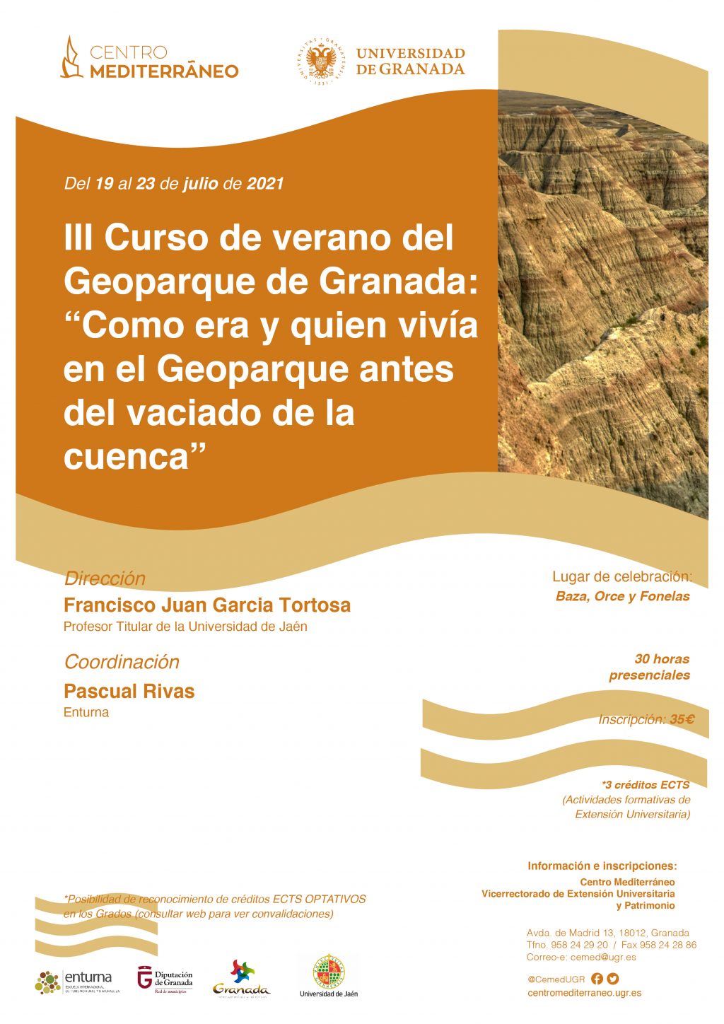III Curso de verano del Centro Mediterráneo sobre el Geoparque de Granada: “Cómo era y quién vivía en el Geoparque antes del vaciado de la cuenca”. Se trata de un curso que estará dirigido por Francisco Juan Garcia Tortosa, profesor titular de la Universidad de Jaén, contando con la coordinación de Pascual Rivas.
