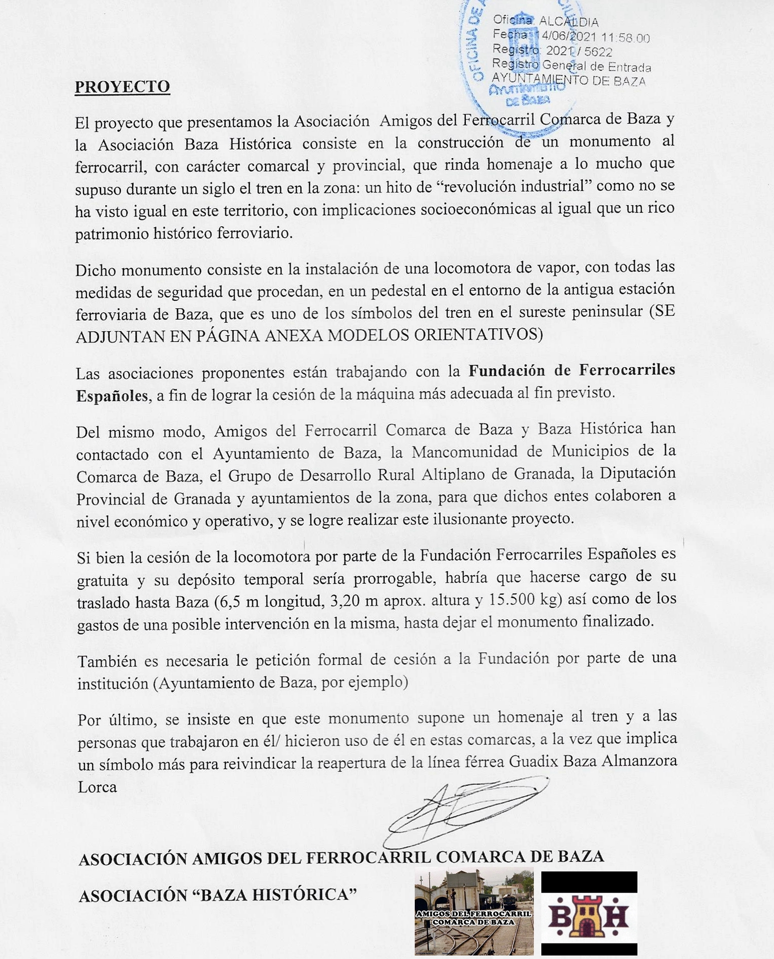 Junto a una memoria introductoria en la que se narra la implantación del tren en las comarcas del sudeste peninsular, su injusto cierre el 31 de diciembre de 1984 y la oportunidad que representa la coyuntura actual para su reapertura, la Asociación Amigos del Ferrocarril Comarca de Baza y la Asociación “Baza Histórica” han registrado el proyecto para la realización de un monumento al ferrocarril de carácter comarcal, provincial y regional, en las instituciones de la zona: Ayuntamiento de Baza, Mancomunidad de Municipios de la Comarca de Baza, Grupo de Desarrollo Rural Altiplano de Granada, Diputación Provincial de Granada y Ayuntamientos de la zona.