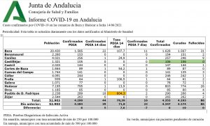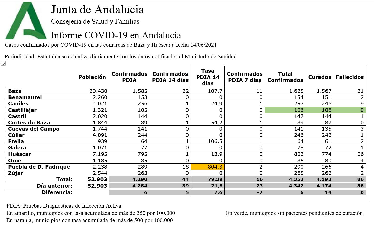 En cuanto a los datos comarcales referidos a Baza y Huéscar, han aumentado en 5 los confirmados a 14 días y han disminuido en 7 los confirmados a 7 días, mientras que la tasa global de ambas comarcas se situaba en 79,39, permaneciendo el municipio de La Puebla de don Fadrique con una tasa superior a 804. Es de destacar también el aumento de curados durante el fin de semana, que han sido 19, y el hecho de que la localidad de Freila, tras muchos días con tasa cero, ha registrado un nuevo contagio que, a causa de su escasa población, la sitúa con una tasa de 106,5, conforme se puede analizar en la tabla adjunta.