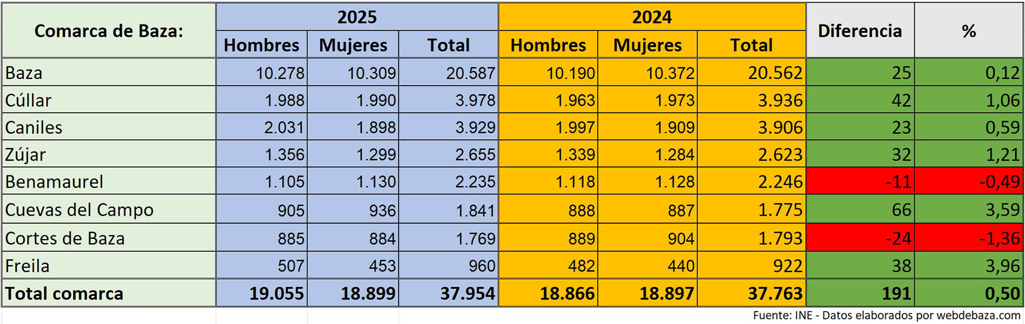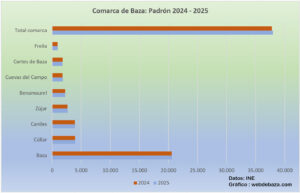 El balance en la comarca de Baza con los últimos datos del Padrón Municipal publicados por el INE, ofrece un crecimiento esperanzador, excepto en Cortes de Baza y Benamaurel. La evolución del padrón municipal entre 2024 y 2025 deja un balance claramente positivo para la comarca de Baza, que en su conjunto gana 191 habitantes, consolidando una tendencia de crecimiento moderado pero significativa en un contexto rural marcado históricamente por la pérdida de población, según los datos que ofrece la última actualización publicada por el Instituto Nacional de Estadística, con cifras referidas al 1 de enero de 2025.