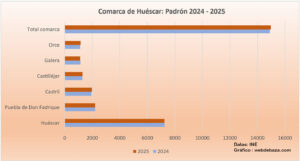 Por otro lado, los gráficos comparativos muestran cómo, en la mayoría de municipios, el padrón de 2025 supera ligeramente al de 2024, reflejando una estabilidad demográfica poco habitual en áreas rurales del interior. El aumento total de la comarca se sitúa cerca de los 38.000 habitantes, consolidando un escenario de mantenimiento poblacional con leves avances.