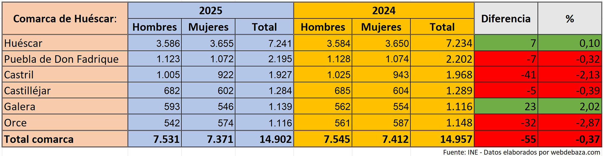 Datos que colocan al municipio de Huéscar como cabecera comarcal y principal núcleo poblacional, el cual logra mantener prácticamente estable su padrón, con un ligero aumento de 7 habitantes (+0,10 %). La población pasa de 7.234 a 7.241 vecinos, un dato que refuerza su papel como punto de equilibrio demográfico dentro de la comarca, amortiguando la caída registrada en otros municipios.