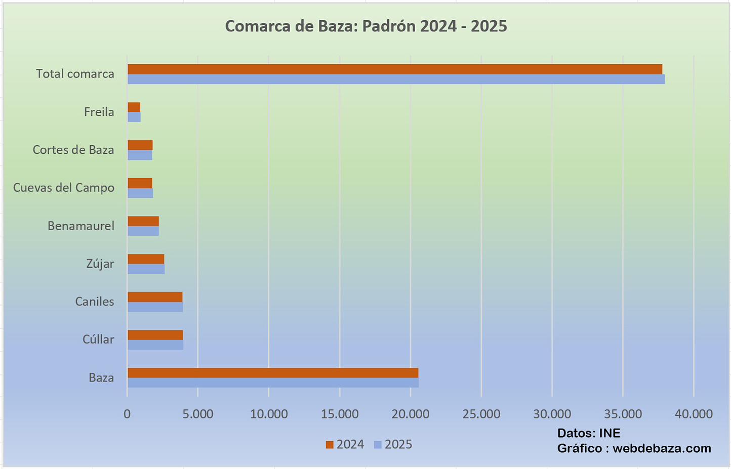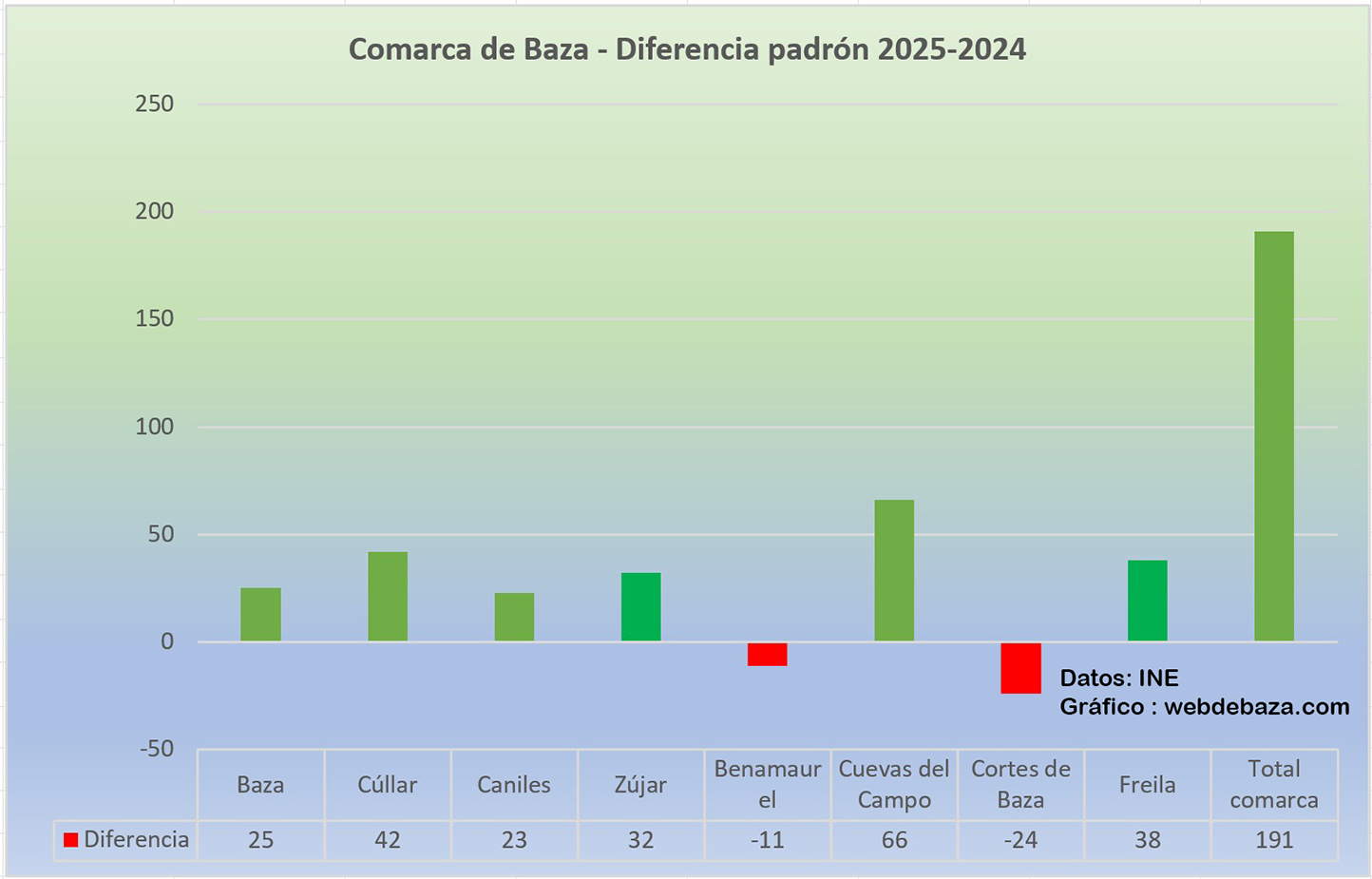 El balance en la comarca de Baza con los últimos datos del Padrón Municipal publicados por el INE, ofrece un crecimiento esperanzador, excepto en Cortes de Baza y Benamaurel. La evolución del padrón municipal entre 2024 y 2025 deja un balance claramente positivo para la comarca de Baza, que en su conjunto gana 191 habitantes, consolidando una tendencia de crecimiento moderado pero significativa en un contexto rural marcado históricamente por la pérdida de población, según los datos que ofrece la última actualización publicada por el Instituto Nacional de Estadística, con cifras referidas al 1 de enero de 2025.