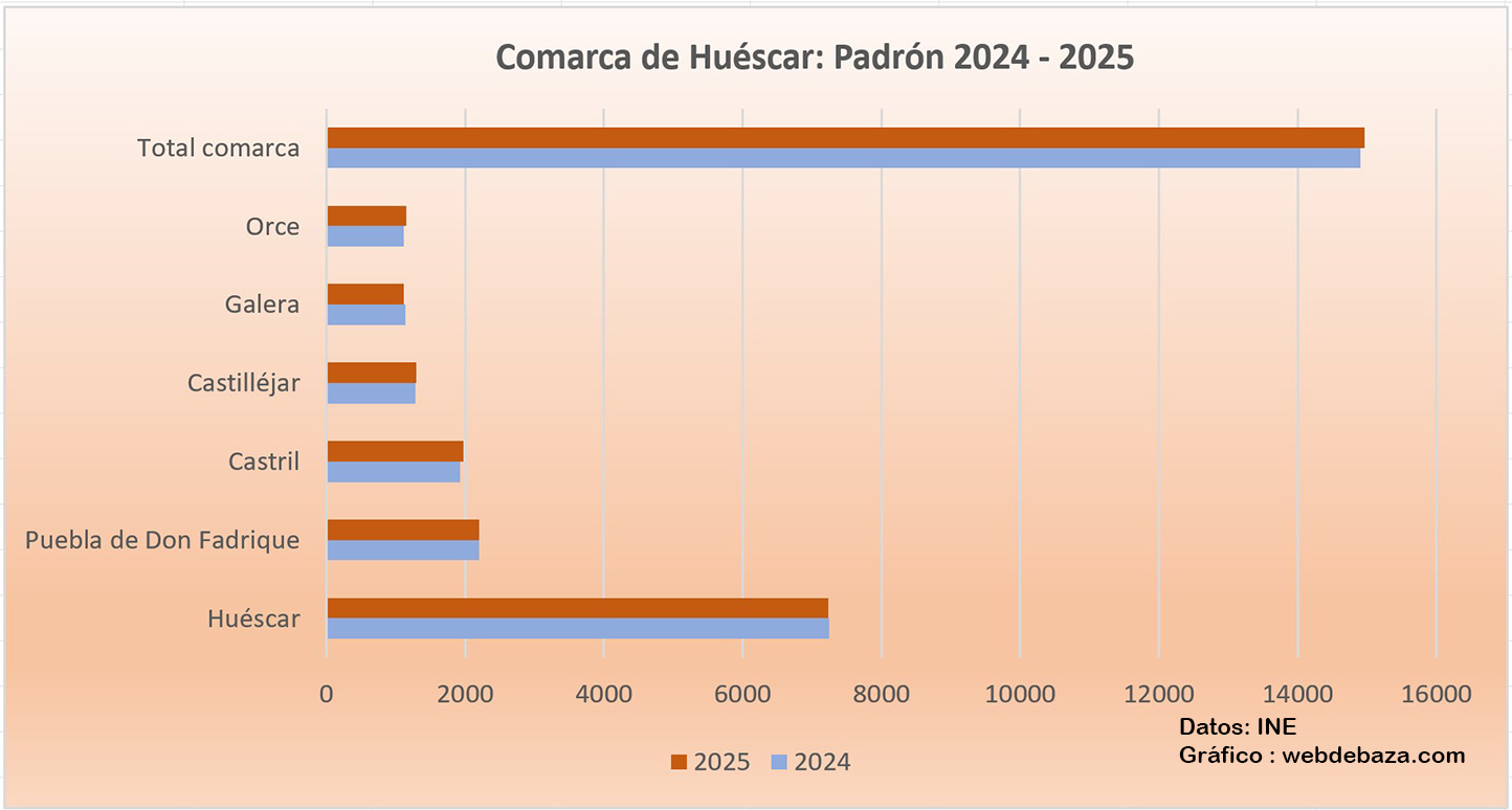 Datos que colocan al municipio de Huéscar como cabecera comarcal y principal núcleo poblacional, el cual logra mantener prácticamente estable su padrón, con un ligero aumento de 7 habitantes (+0,10 %). La población pasa de 7.234 a 7.241 vecinos, un dato que refuerza su papel como punto de equilibrio demográfico dentro de la comarca, amortiguando la caída registrada en otros municipios.