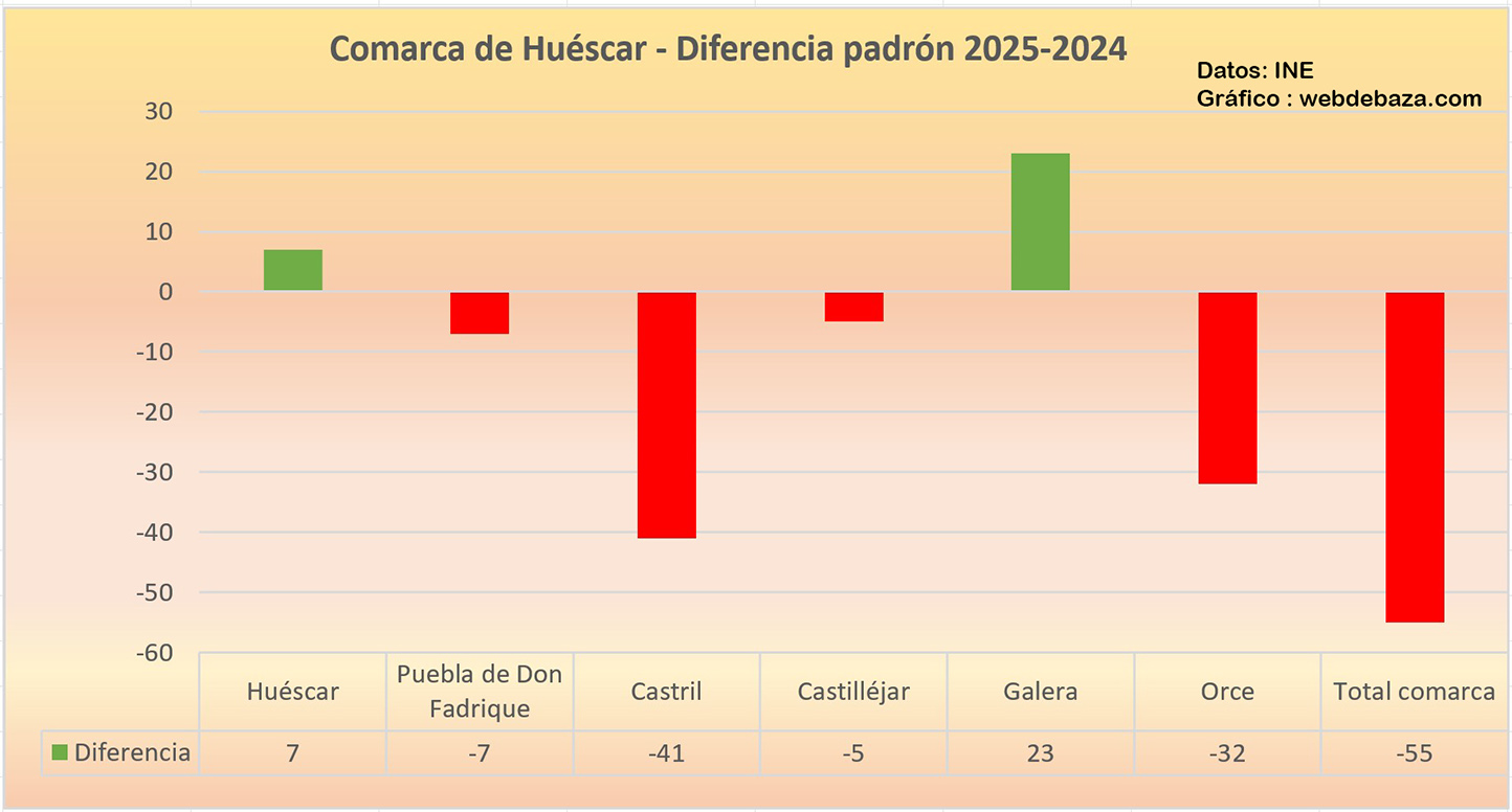 La publicación del último padrón por parte del INE pone de manifiesto un ligero retroceso demográfico en la comarca de Huéscar, donde solo crecen Galera y la capital comarcal. El padrón de 202, publicado la semana pasada por el Instituto Nacional de Estadística, refleja que la comarca de Huéscar pierde 55 habitantes respecto al año anterior, pasando de 14.957 personas en 2024 a 14.902 en 2025, lo que supone un descenso del 0,37 %. Se trata de una variación moderada, pero significativa en un territorio con una población ya ajustada y muy sensible a pequeños movimientos.