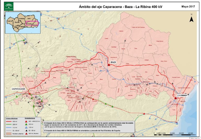 Comienza el periodo de información pública del proyecto de línea de alta tensión 400 kv Baza-La Ribina, iniciando así la tramitación de construcción de la línea proyectada por REE. El Boletín Oficial del Estado publicaba ayer, en el enlace https://www.boe.es/boe/dias/2021/11/15/pdfs/BOE-B-2021-46303.pdf, el anuncio de las Dependencias de Industria y Energía de las Subdelegaciones del Gobierno en Granada y Almería, por el que se somete a información pública la tramitación de construcción de la línea de alta tensión a 400 Kv doble circuito Baza-La Ribina, línea de transporte de energía eléctrica que discurre por ambas provincias.