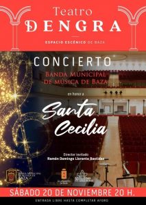Programación cultural de esta semana: Concierto de la Banda Municipal de Música en honor a Santa Cecilia y VIII Festival Flamenco Peña Arremate. El Ayuntamiento de Baza continúa con el desarrollo de la programación cultural diseñada para este mes de noviembre y propone este fin de semana dos citas en el Teatro Dengra. La primera, el concierto de la Banda Municipal de Música de Baza en honor a Santa Cecilia, tendrá lugar el sábado a partir de las 20h con entrada libre hasta completar el aforo. Se contará con Ramón Domingo Llorente Bastidas como director invitados.
