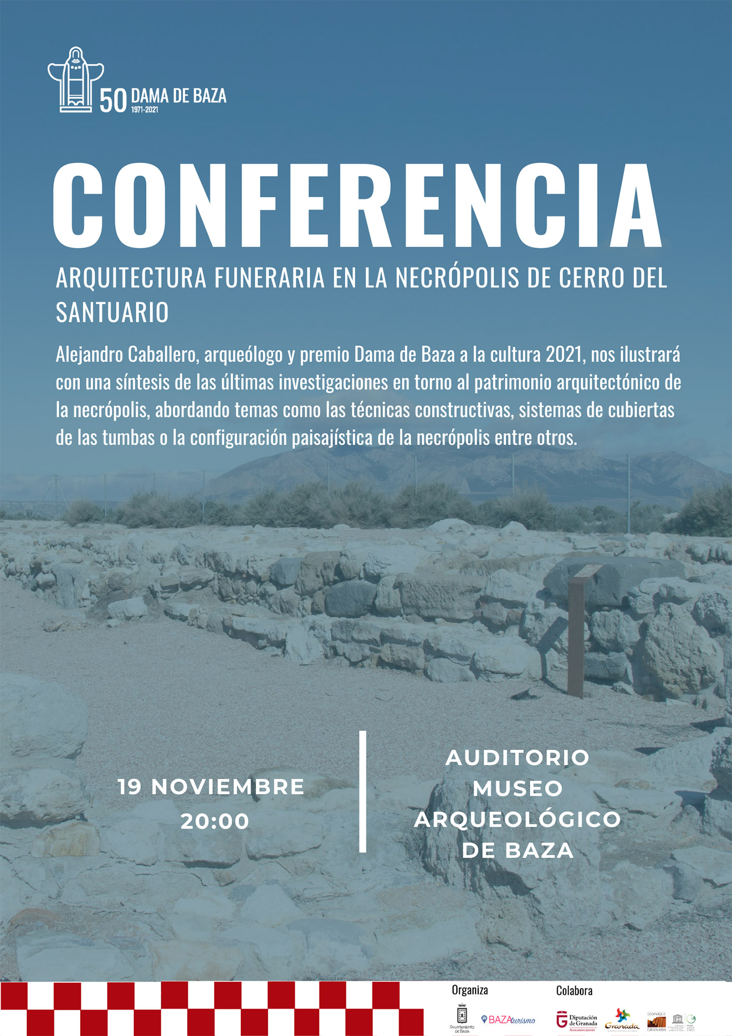 La próxima tendrá lugar este viernes 19 de noviembre, en el Auditorio del Museo Arqueológico de Baza. Allí el arqueólogo y Premio Dama de Baza a la Cultura 2021, Alejandro Caballero, impartirá la conferencia “Arquitectura funeraria en la necrópolis de Cerro del Santuario”. En ella ofrecerá una síntesis de las últimas investigaciones en torno al patrimonio arquitectónico de la necrópolis, para lo que abordará temas como las técnicas constructivas, sistemas de cubiertas de las tumbas o la configuración paisajística de la necrópolis, entre otros.
