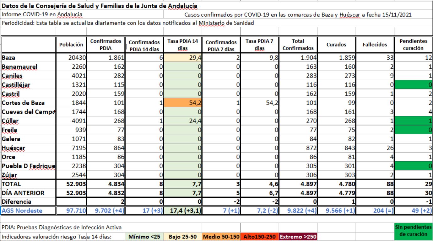 Añadir también que, un día más, la comarca de Huéscar seguía manteniendo sin novedades a todos sus municipios, todos ellos en tasa 0 a 14 días.