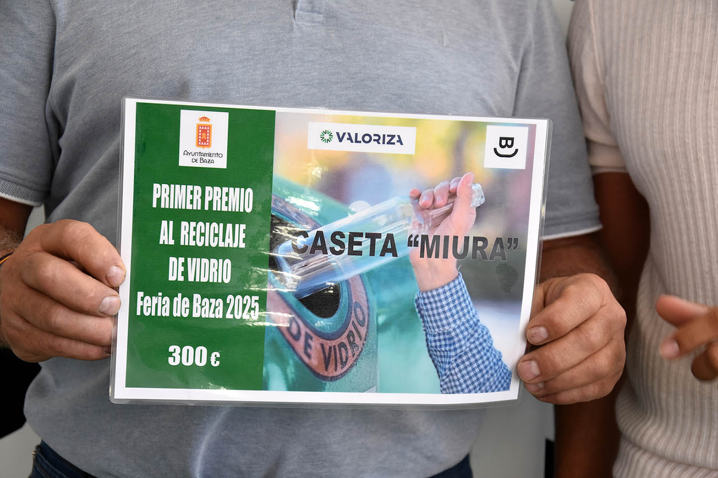 Como incentivo, el Ayuntamiento de Baza ha otorgado el primer Premio al reciclaje de vidrio a la caseta Miura, que recibió un diploma y una dotación económica de 300 euros. El acto contó con la presencia del concejal de Mantenimiento, Rafael Azor, el presidente de EMUVIBA, José Antonio Valdivieso, y el responsable de Valoriza en la ciudad, Sergio Yeste.