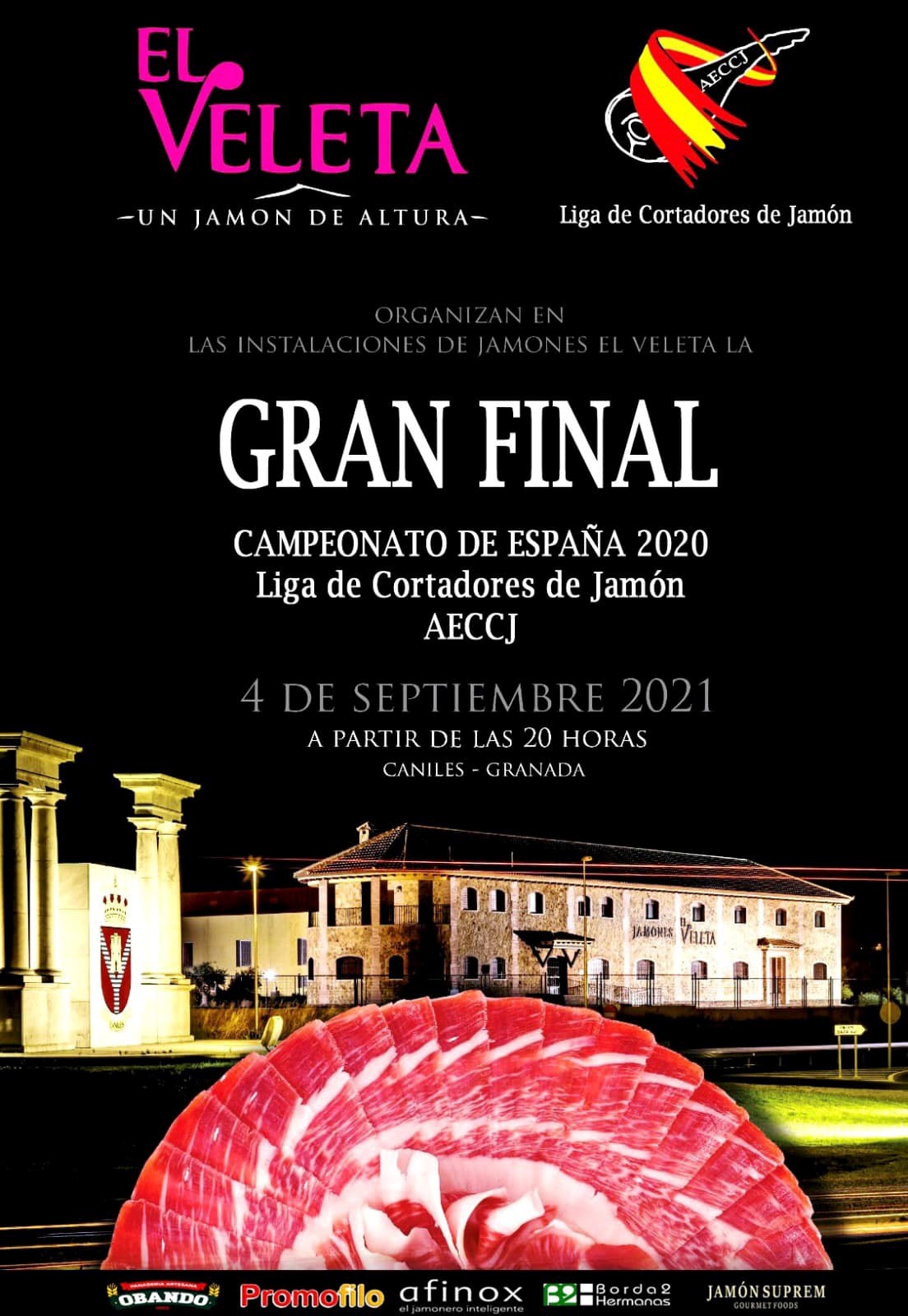 Gran final del Campeonato de España 2020 Liga nacional de cortadores de jamón AECCJ organizado por Jamones El Veleta y la directiva de la asociación de la Liga. La Final del Campeonato de España de la Liga Nacional de Cortadores de Jamón es el evento estrella y la culminación de una serie de concursos de corte de jamón que se desarrollan a lo largo de un año en varias localidades del territorio español. En estos concursos los participantes van consiguiendo puntos que lleva a disputar a los 8 primeros clasificados el título de Campeón Nacional de la Liga de Cortadores.