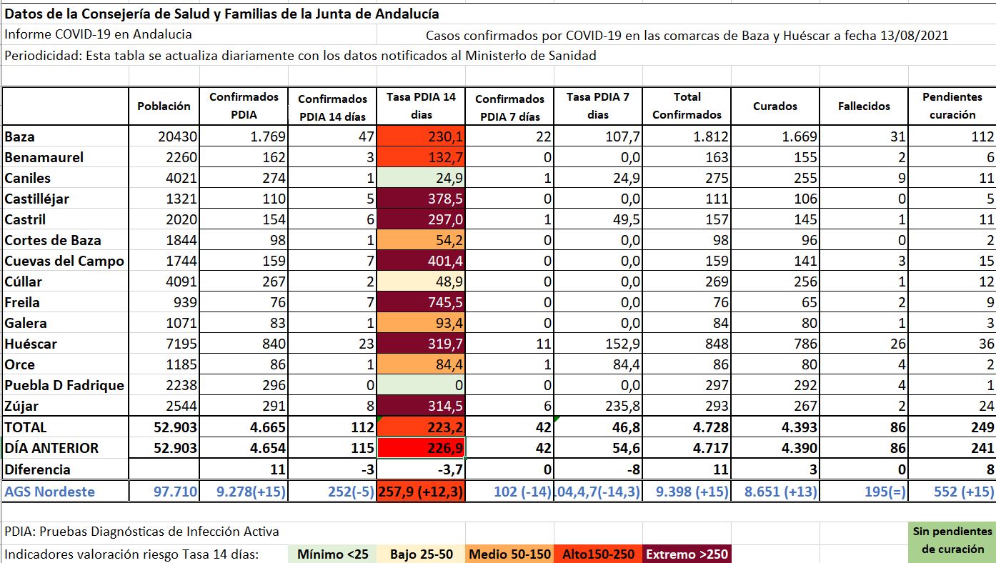 En cuanto a los datos de las comarcas de Baza y Huéscar, las últimas cifras ofrecidas por la Consejería de Salud son las del 13 de agosto y hablan de 11 confirmados en esta zona y repartidos 5 en Baza, 4 en Zújar, 1 en Huéscar y 1 en Orce, si bien hay leves descensos globales en las tasas de incidencia de los 14 municipios, tanto a 7 como a 14 días y se añaden 3 nuevos curados en Baza, Cortes de Baza y Cuevas del Campo.