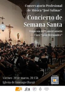 El Conservatorio “José Salinas” ofrece en Baza su concierto de Semana Santa con orquesta y coro. El Conservatorio Profesional de Música José Salinas celebrará el próximo viernes 20 de marzo su tradicional concierto de Semana Santa, una cita musical que reunirá a alumnado y profesorado del centro en una actuación abierta al público. El recital tendrá lugar a partir de las 20:15 horas en la Iglesia de Santiago, con entrada libre hasta completar aforo.