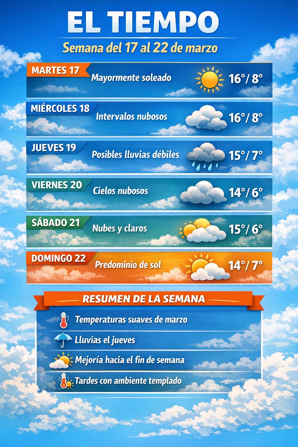 Climatología de transición la que nos traerá el tiempo desde el martes 17 al domingo 22 de marzo. La semana meteorológica que se abre este martes 17 de marzo estará marcada por una situación relativamente estable al inicio, con un cambio hacia cielos más nubosos y posibilidad de precipitaciones a mitad de semana, antes de una ligera mejoría hacia el fin de semana.