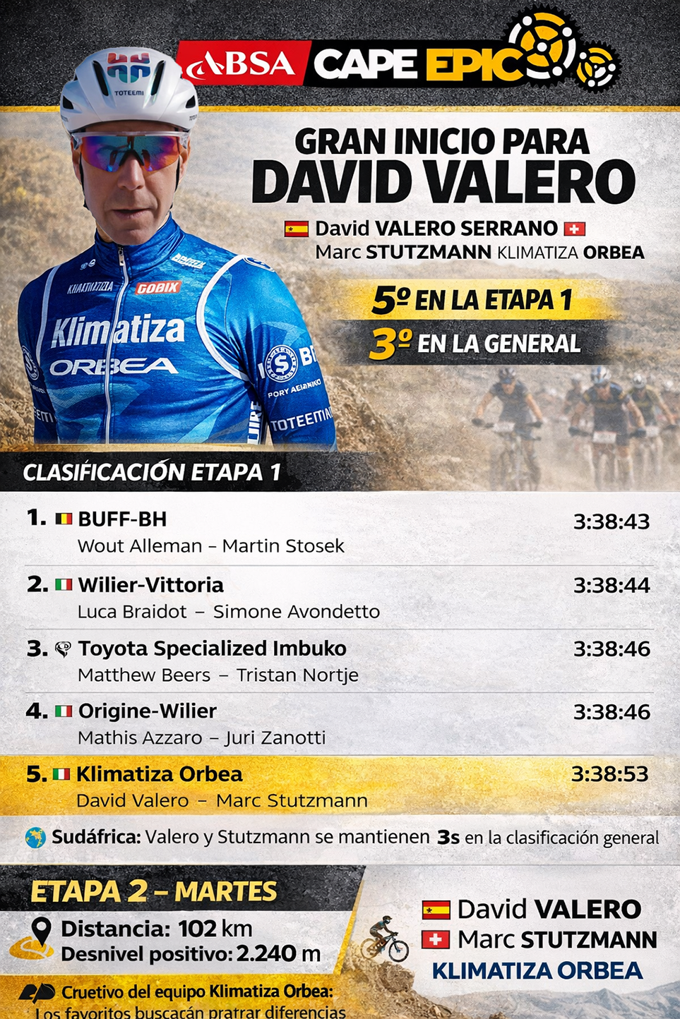 Valero se mantiene en el podio de la Cape Epic tras una etapa muy disputada. La Absa Cape Epic continúa mostrando desde sus primeras jornadas por qué está considerada como el auténtico Tour de Francia del mountain bike. La primera gran etapa en línea volvió a ofrecer un ritmo altísimo y una lucha constante entre las mejores parejas del mundo.