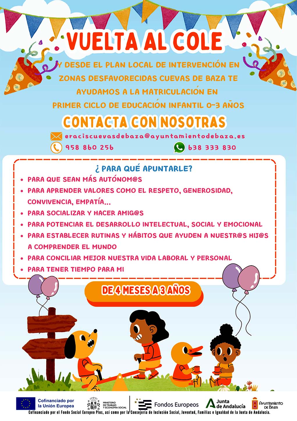 El Plan Local Cuevas de Baza ofrece ayuda para la matriculación de los niños en Centros de Educación Infantil y Escuelas Infantiles. Uno de los objetivos del Plan Local de Intervención en Zonas Desfavorecidas Cuevas de Baza, a través del programa ERACIS+, cofinanciado por el Fondo Social Europeo Plus, así como por la Consejería de Inclusión Social, Juventud, Familias e Igualdad de la Junta de Andalucía, es promocionar la escolarización temprana de los niños y niñas de la Zona Desfavorecida Cuevas de Baza en los niveles 0-3 y 3-6 años como medida de conciliación de la vida personal, familiar y laboral de las personas usuarias. Las posibilidades de conciliación refuerzan la independencia y la autonomía, mejoran el nivel de empleabilidad y por ende la inserción laboral especialmente de mujeres.
