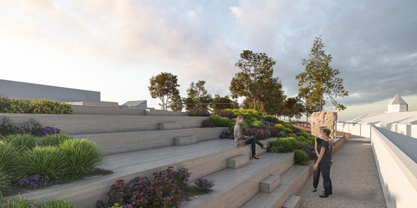 Una vez finalizada la demolición de la estructura y restos del mirador, se plantea como solución más urgente el recalce de la muralla y la contención del terreno con unos muros que combinan hormigón y madera para integrarlos en el paisaje y, al mismo tiempo, reforzar la sujeción de los restos. Los muros se van a retranquear con respecto a la línea de muralla, de manera que se acota y se visibiliza el límite. Siempre partiendo de la compatibilidad de materiales y de la consolidación de los restos. Se prevé además habilitar una plaza con una imagen en consonancia con la de la Cava Alta, la intervención en la parte central que separa la Alcazaba nueva de la antigua y el acondicionamiento del resto de espacios públicos. Para diferenciar la zona antigua de la nueva se propone un pavimento con diferentes tonalidades y de tipo blando para poder hacer nuevas excavaciones en el futuro.