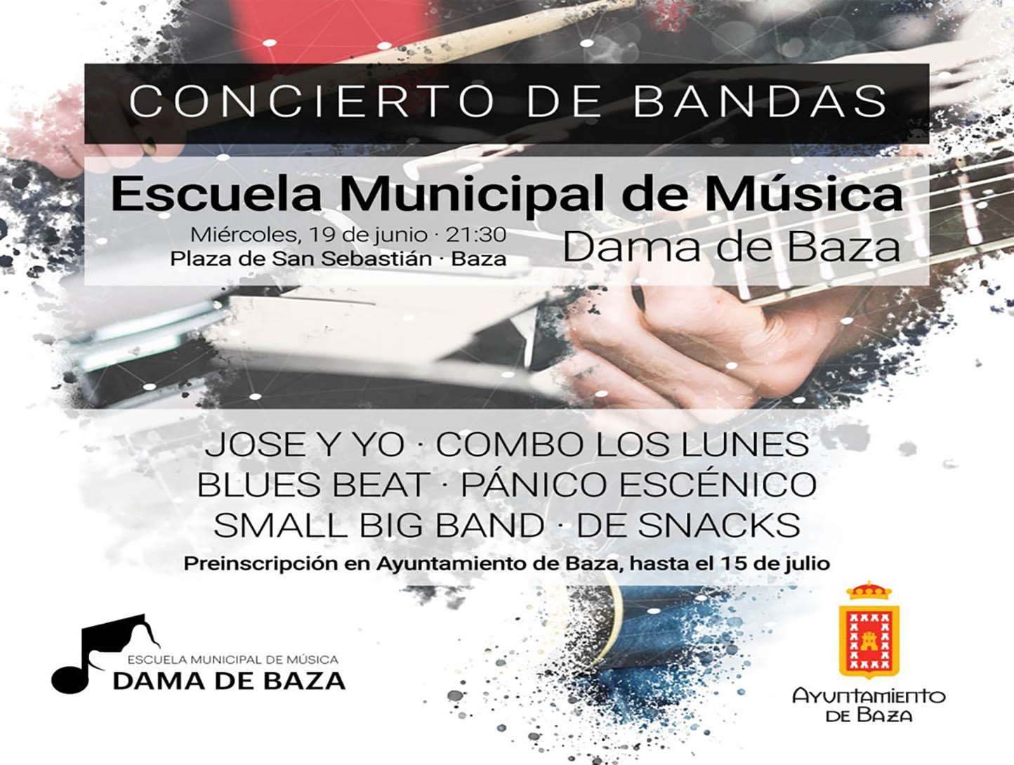 La Escuela Municipal de Música “Dama de Baza” ofrece un concierto con seis bandas mañana miércoles. La Escuela Municipal de Música es una entidad que ofrece a las personas interesadas poder recibir formación en diferentes especialidades, tales como piano, guitarra o lenguaje musical, con una formación que se imparte a lo largo de un periodo coincidente con el curso escolar.
