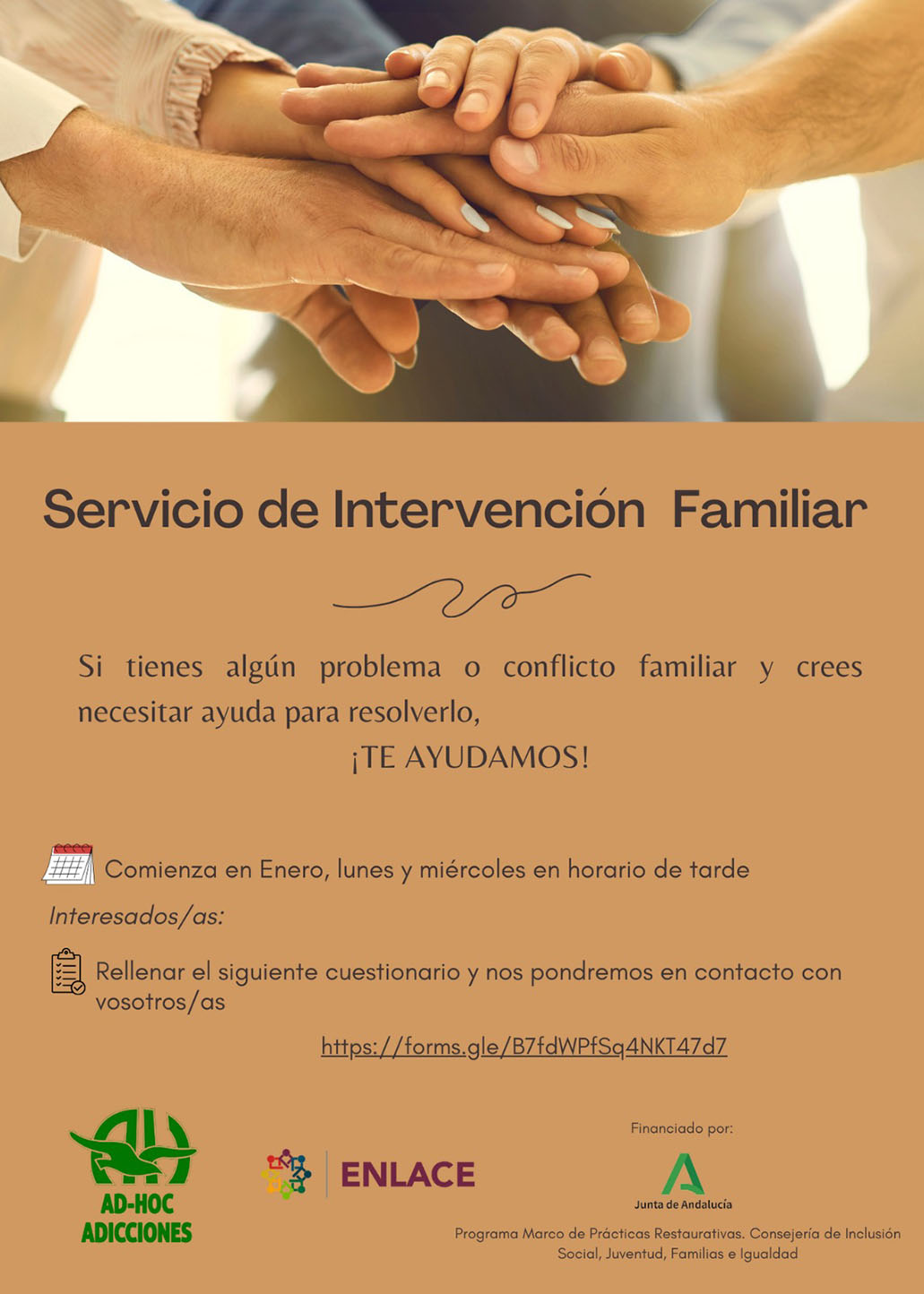 La Asociación Ad-Hoc desarrolla una intervención con familias en exclusión social a través del Programa Marco andaluz de prácticas restaurativas para la cohesión social. La Asociación Ad-Hoc de Atención a Personas con Problemas de Adicciones está desarrollando el “Programa Marco andaluz de prácticas restaurativas para la cohesión social” subvencionado con cargo a la asignación tributaria del IRPF por la Consejería de Inclusión Social, Juventud, Familias e Igualdad y en colaboración con la Federación Andaluza ENLACE.