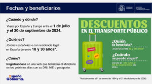 Respecto al programa Verano Joven, en Andalucía serán cerca de 1,2 millones de jóvenes de entre 18 y 30 años los destinatarios de los descuentos para viajar en autobús y tren entre el 1 de julio y el 30 de septiembre. Las rebajas serán del 90% para servicios de autobús regular de competencia estatal, 90% en los servicios de media distancia convencional y en red de ancho métrico, 50% en los títulos sencillos de Avant, 50%, con un máximo de 30 euros por billete, para servicios comerciales de larga distancia o alta velocidad de todos los operadores ferroviarios, así como del 50% del Global Flexible de Interrail de 10 días en 2 meses, cuando se comercialice a través de Renfe.