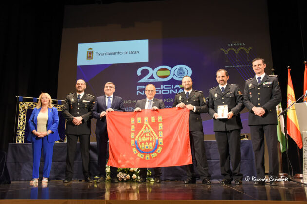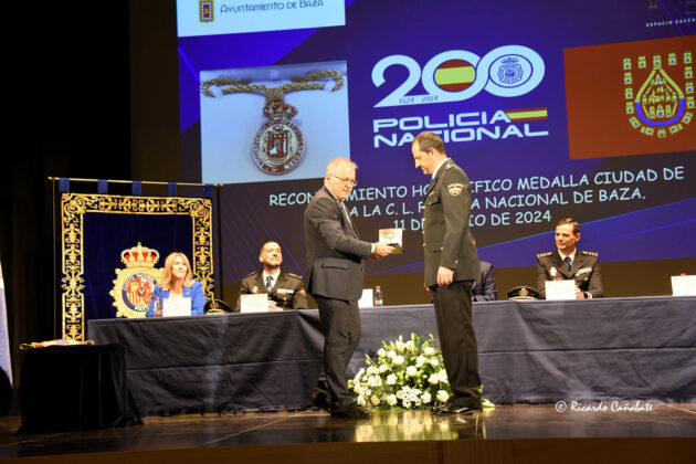 De la entrega de este reconocimiento se encargó el alcalde de Baza, Pedro J. Ramos, en nombre de todos sus vecinos, entregando la Medalla de la Ciudad a la Comisaría de Policía Nacional de la localidad, la cual fue recibida, en representación de todos sus compañeros y de los cargos superiores, por el responsable actual de esta institución, el Comisario Jefe, Mario López.