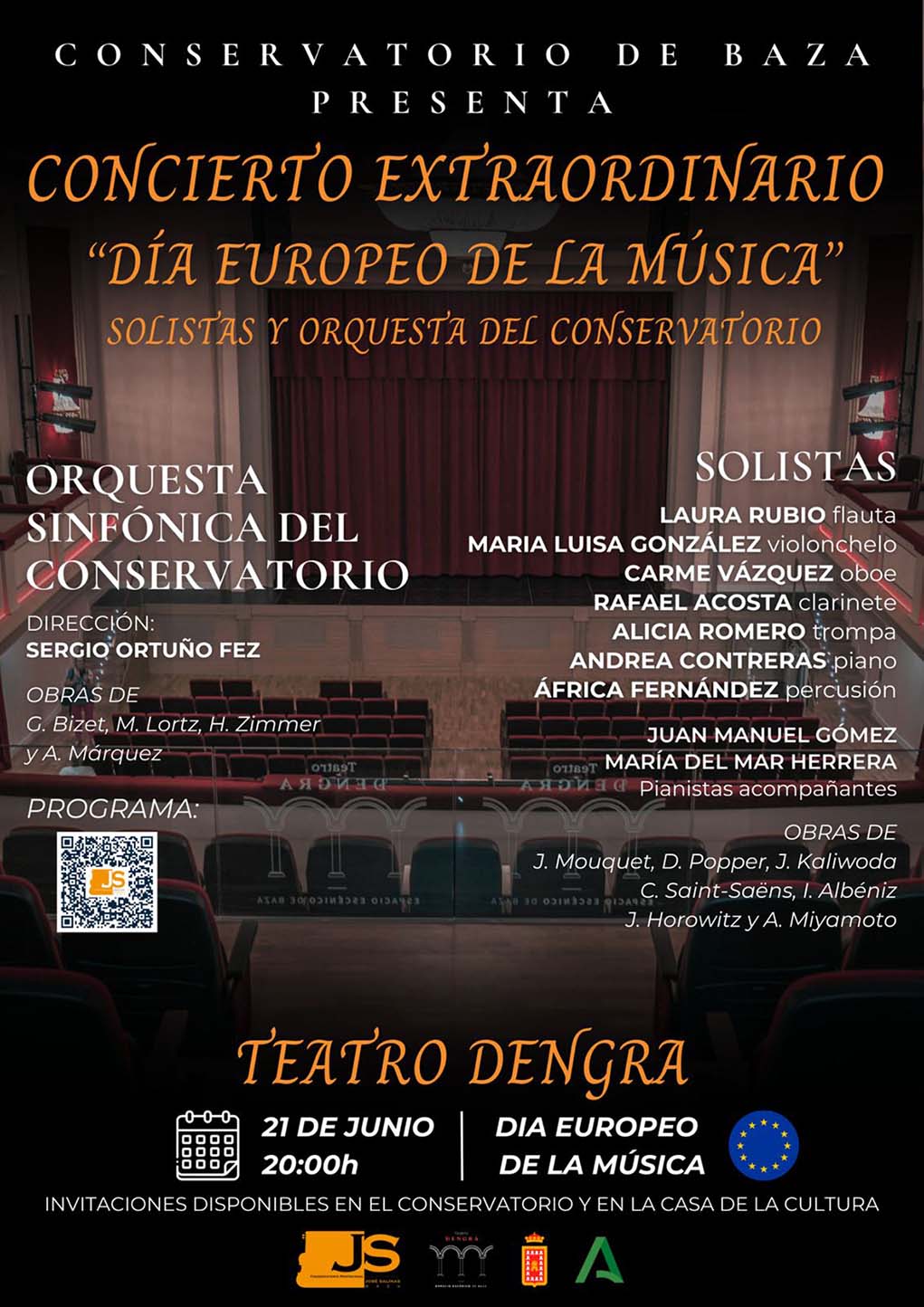 La Orquesta Sinfónica del Conservatorio de Baza y varios solistas ofrecen un concierto extraordinario, el 21 de junio en el Teatro Dengra, por el Día Europeo de la Música. Con motivo del Día Europeo de la Música, el Conservatorio Profesional de Música “José Salinas” de nuestra ciudad ha preparado un concierto extraordinario que se celebrará el viernes 21 de junio, a partir de las 20:00 h. en el teatro Dengra. Las invitaciones para acudir como público están disponibles en el mismo Conservatorio y en la Casa de la Cultura.