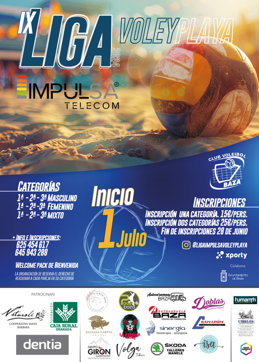 Abierta la inscripción para la IX Liga de Voley Playa, que empieza el 1 de julio que organiza el  Club Voleibol Baza. Hasta el 28 de junio estará abierto el plazo para inscribirse en la novena edición de la Liga de Voley Playa Impulsa Telecom, que echa a andar el lunes 1 de julio y cuenta con la colaboración del Ayuntamiento bastetano.