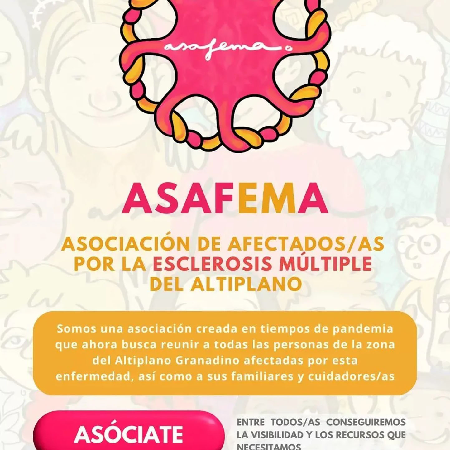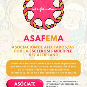 Desde ASAFEMA, «Asociación de afectados/as por la esclerosis múltiple del Altiplano » queremos hacer llegar nuestro apoyo a todas personas que conviven a diario con esta enfermedad, tanto a los pacientes como a sus cuidadores y familiares, de todo el Altiplano, dándoles la oportunidad de asociarse, con el fin de mejorar nuestra calidad de vida.
