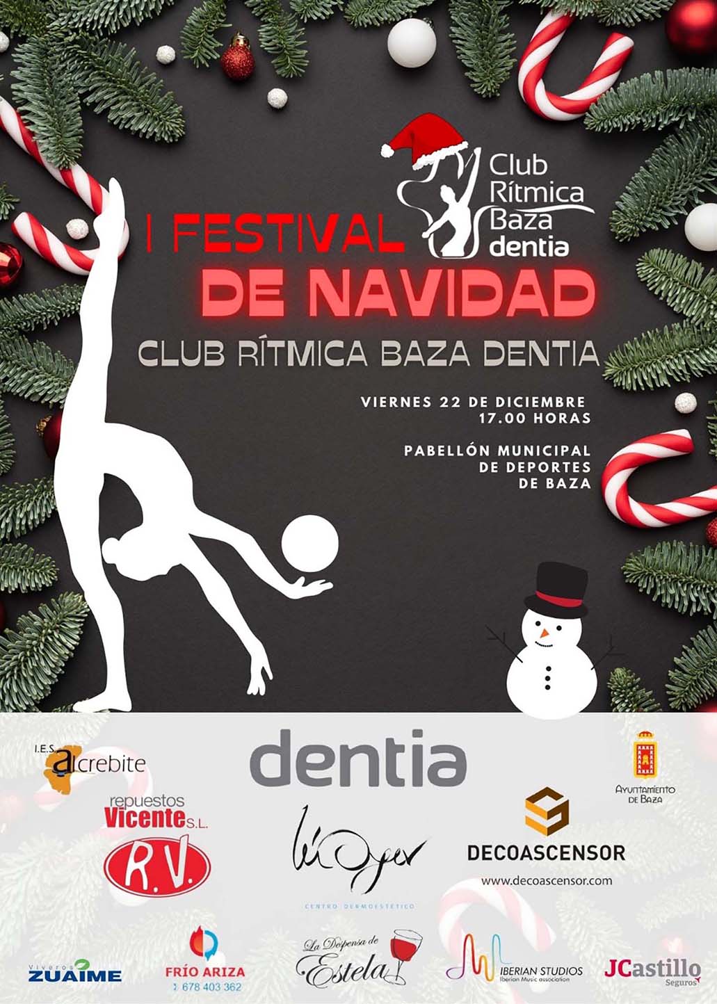 El Club Rítmica Baza Dentia invita a los bastetanos a presenciar su I Festival de Navidad. El Club Rítmica Baza Dentia celebra su I Festival de Navidad, que tendrá lugar el próximo viernes 22 de diciembre, a las 17.00 h., en el Pabellón Municipal de Deportes de Baza, con entrada gratuita para todo el mundo.