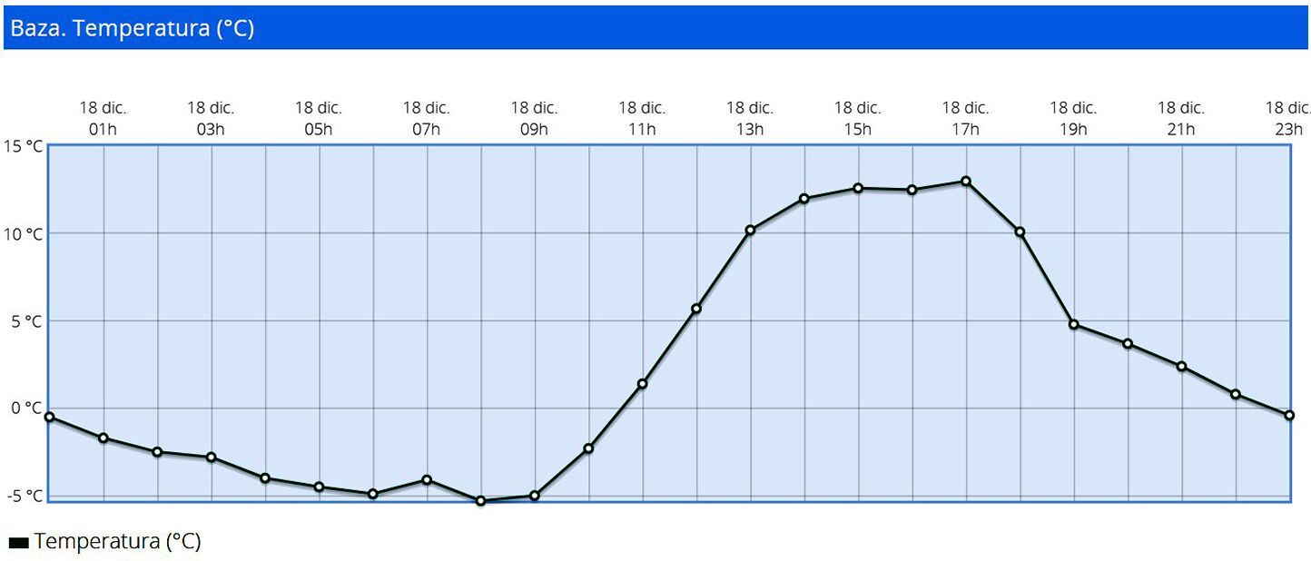 Estamos en una situación en la que ayer se registraba una mínima de -5,6 grados en nuestra ciudad, a las 8,20 h., en una jornada en la que Baza permaneció más de once horas con temperaturas por debajo de la cota de los cero grados, superando incluso los -4,1 de Pradollano, en Sierra Nevada, los 2,9ºC del aeropuerto granadino en Chauchina, los -2,6ºC de la sevillana Puebla de los Infantes o los -2,4ºC de Valsequillo, en la provincia de Córdoba, que fueron los cinco valores más bajos de las mínimas registradas en Andalucía.
